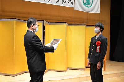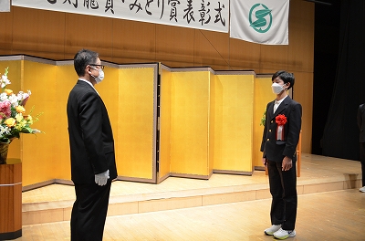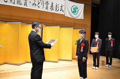 丹波篠山市教育委員会が、成績、功績、貢献、奉仕、社会づくり等で顕著な実績を上げた者を表彰するみどり賞表彰式が2月11日にありました。本校からは、団体では全国大会で活躍した篠山・丹南ホッケー部、個人では、ホッケーU15ジュニアユース日本代表に選ばれた3年生男子2名、陸上競技400mで全国大会に出場した3年生男子1名が表彰を受けました。