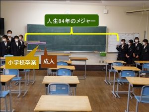 1 今日はメジャーをもってきました。1年を5cmとします。人間の平均寿命は84歳ぐらいですから、だいたい4.2mぐらいです。それでは12歳の位置はどれぐらいになりますか。(60cm)、高校卒業18歳の位置は(90cm)、大学卒業22歳の位置は(110cm)となります。こうしてみると、人生の長さに比べて、また、みなさんが小学校卒業まで過ごした時間に比べて、18歳で大人になるのは目の前となります。そして、中学校は、体も、心も、頭も、人生で一番成長する時期で、社会人の基礎となる力をつける時期になります。