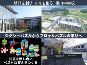 2 篠山中学校では、将来や社会の糸口をつかむために、学校の取り組みを工夫しています。これからの世界は、ブロックパズルの解き方への発想の転換が必要だと言われています。スライドの絵のようにジグソーパズルは一つしかない答えに向けてはやくとければいいのですが、これからの社会は正解が一つということはありません。例えば、新型コロナウイルス対策についても、世界じゅうの人々が知恵を寄せ合い、いくつもある答えの中からより、ベストな答えを見つけようとしています。このように、仲間とコミュニケーションをとりながら、答えのない課題によりベストな答えをつくる力が、これからの社会では必要なのです。中学校は勉強が難しい。部活がしんどい。等の不安があると思いますが、仲間と一緒に活動することで乗り越えることができます。そして、コミュニケーションで知恵を出し合い、明日を創り、未来を創ることを篠山中学校は大切にしています。