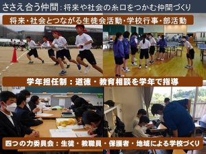 3 生活では、いろいろなことに生徒が挑戦しています。学校行事、生徒会活動、部活動などで仲間と対話しながら、合唱やダンス、グループ活動などつくりあげています。また、生徒を支えるため、学年担任制度でいろいろな先生が教育相談や道徳の授業を行います。部活動についても先日丹有地区大会があり、多くの部活が県大会に出場するなど成果をあげています。地域との連携も大切にしています。生徒・先生・保護者・地域の4つの力で、学校について協議しています。また、トライやる・ウィークだけでなく、地元企業によるICT指導等、本物の体験を大切にしています。