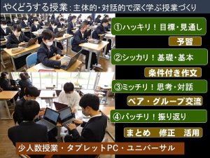 4 次に授業です。中学校になると勉強の不安もあると思いますが、科学的に学びが深まる方法は、人に教えたり、教えてもらったりして思い出すこととされています。そのために授業スタンダードにそった授業をしています。①予習などで授業をつかむ②作文等に挑戦する③ペアやグループで交流し、深める④まとめたりやりなおしたりして振り返る の4つのことをどの授業でも行います。また、数学は難易度を選択するコース制で行っていますし、タブレットPCの活用も盛んです。また、授業の流し方や字の大きさなどを統一するユニバーサルデザインの授業で皆さんの勉強を分かるようにしています。