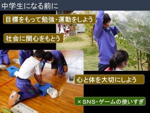 3つ目、心と体を大切にしてください。学習や部活動の時間が増えますから、規則正しい生活を心がけてください。小学校時代からゲーム中毒で心身のバランスを崩す人がいますので直して下さい。