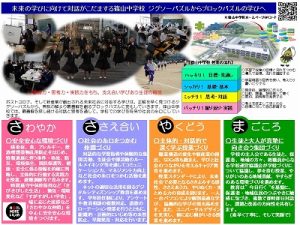 6 半年後、みなさんが篠山中学生の一員として一緒に学校をつくることを楽しみに待っています。子どもから大人へと向かう思春期は、いろんな悩みや上手くいかないことも起こりますが、篠山中学校の先生は厳しいけれど、温かく優しく教えます。どうぞ、安心して中学校へ来てください。今の説明をまとめたパンフレットをお配りしますので、家庭で一緒に見てください。また、篠山中学校のHPは毎日更新しています。学校の様子などあげておりますので参考に見てください。