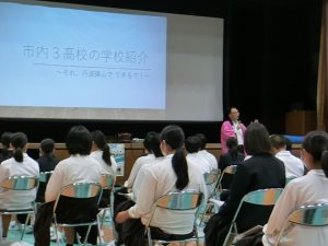 6月1日に丹波篠山市教育委員会による市内三高校の説明会(学校紹介)を中学校でおこないました。3年生にとっては中学校卒業後の進路を具体的に考えていかなければならない時になっています。一番身近な市内の高校の様子を知り、これからも主体的に学びを続けていく意欲につなげ、あわせて将来を考える機会にしてほしいと思います。今回は短時間の紹介でしたので、これからのオープンハイスクール等を利用しながら自分に合った進路選択ができるようにしていきましょう。(写真は丹後教育長のごあいさつ)