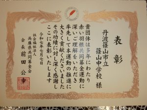 今年も赤い羽根共同募金運動に生徒会が取り組み、その表彰をうけました。贈呈式は11月17日でしたが、出席できなかったために学校で生徒会代表に授与していただきました。長年にわたって募金を呼びかけ、継続して募金活動をしているということでの表彰です。募金に協力してくれた生徒の皆さんに感謝します。ありがとうございました。