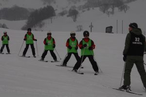 今日の天候は曇り。気温は低いですが、さわやかな空気の中、午前、午後合わせて5時間30分の実習をしました。曲がり方や止まり方もマスターし、何度もリフトに乗って滑りました。多くの班が林間コースや中央ゲレンデでの滑りを楽しみました。
