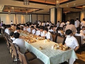 修学旅行2日目です。午前中はホテル前のビーチでマリン体験と琉球村での文化体験に別れて、それぞれ沖縄らしさを体験しました。午後は美ら海水族館で班別研修。たくさんの海の生き物を見たりお土産を買ったりして、すぐに時間が過ぎました。天気にも恵まれ、全員楽しく元気に2日目の活動を終えました。
