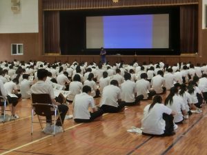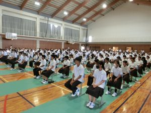 9月1日(月)、2学期がスタートしました。夏休み中は厳しい暑さの日が多く、生徒たちの体調や事故等の心配をしていましたが、朝から元気な挨拶の声を聞いたり、落ち着いて始業式に臨む姿を見たりして安心しました。始業式では校長から「自分にとって大切なことに時間を使う」ことを改めて話しました。2学期は少し長めの学期ですが、大きな行事もあり、生徒たちが活躍する機会もたくさんあります。友達との絆を深め、目標をもって日々を過ごしてくれることを期待しています。転入生が1名あり、全校生は331名になりました。また、新しく2名のALTを迎えています。夏休みをうまく過ごせた人も、そうでなかった人も今日を節目に改めて再スタートを切ってほしいと思います。
